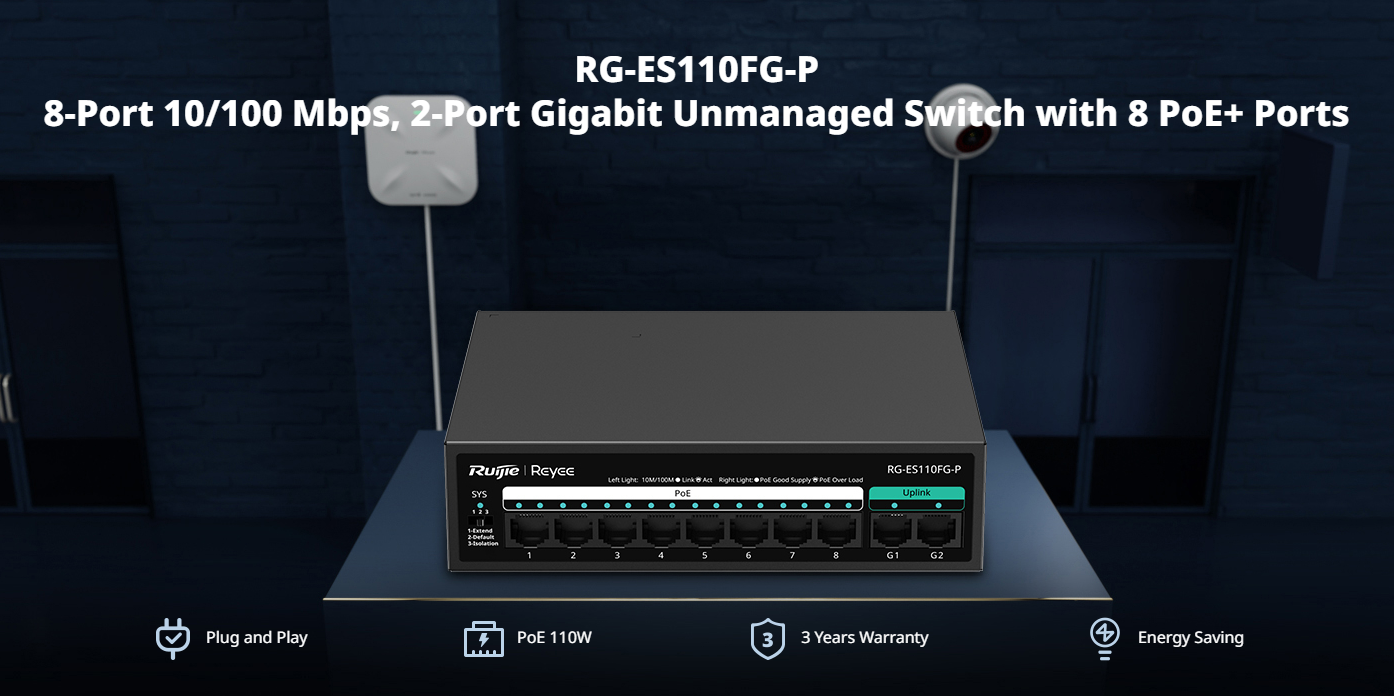 Reyee RG-ES110FG-P, 8-Port 100Mbps + 2 Uplink Port 1000Mbps, 8 of the ports support PoE/PoE+ power supply. Max PoE power budget is 111W, Steel Case