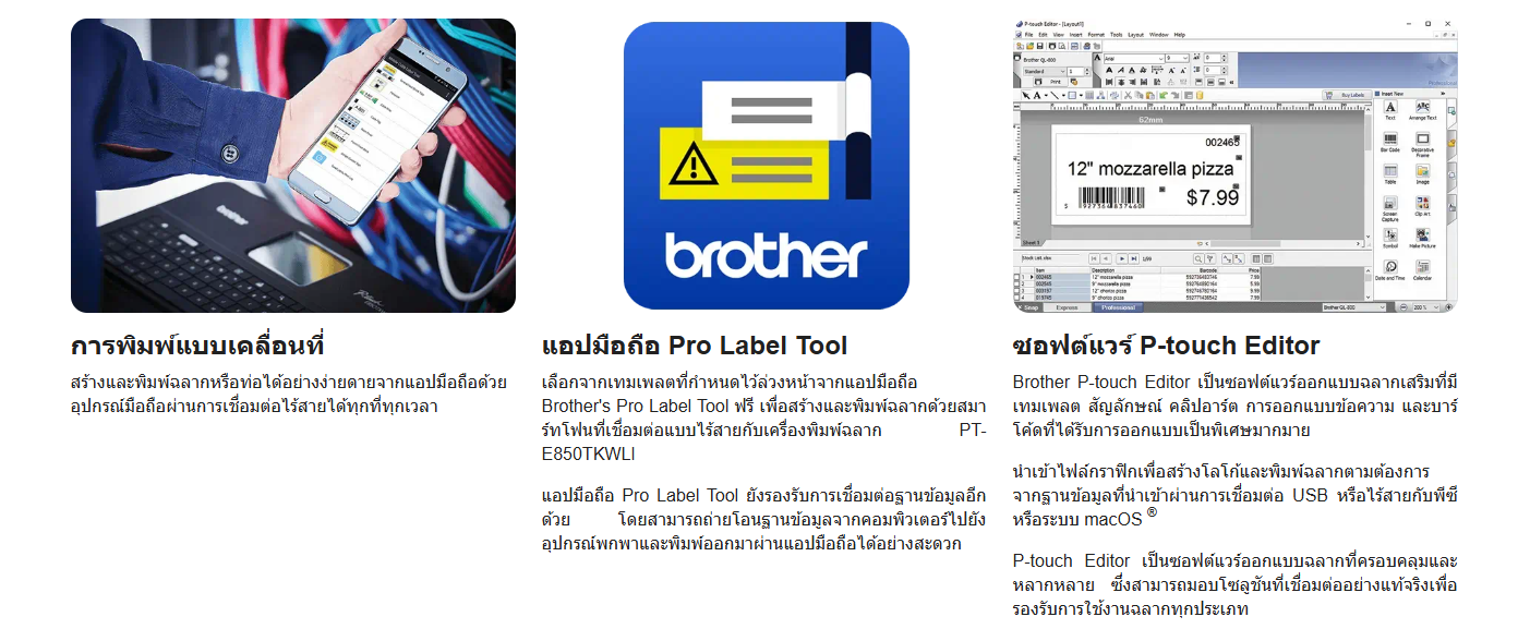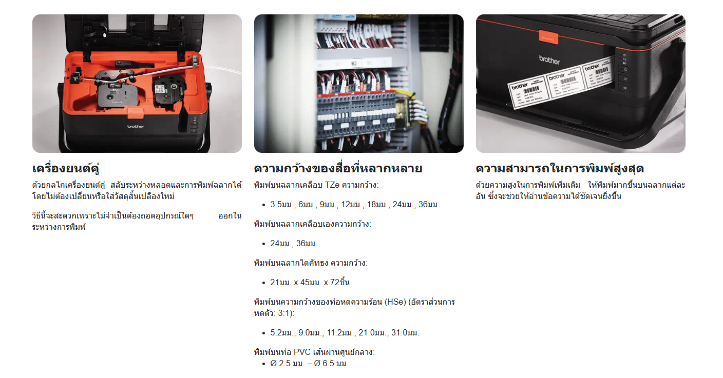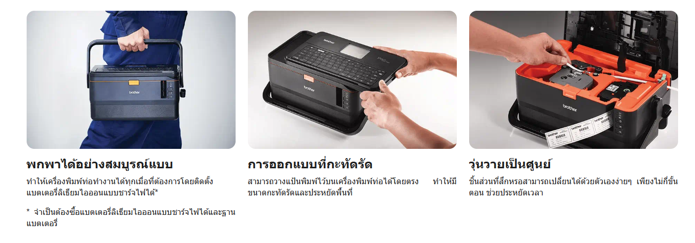เครื่องพิมพ์ปลอกท่อ PVC และฉลาก แบบพกพา, พิมพ์ปลอกท่อ PVC 40 mm/sec และพิมพ์ได้สูงสุด 2 บรรทัด, รองรับปลอกท่อ PVC ขนาดเส้นผ่าศูนย์กลาง 2.5 6.5 mm, พิมพ์ฉลากเร็ว 60-80 mm/sec ความละเอียด 360 dpi, พิมพ์ได้เต็มฉลากยิ่งขึ้น 32mm (Print Height), สามารถออกแบบฉลากโดยใช้โปรแกรม P-touch Editor V5.1 และ Cable Label Tools 1.0, วัสดุการพิมพ์ TZE และ HGE เทป ขนาดตั้งแต่ 3.5-36 mm รวมถึงเทป HSE เทปสำหรับท่อหด (Heat Shrink Tube)