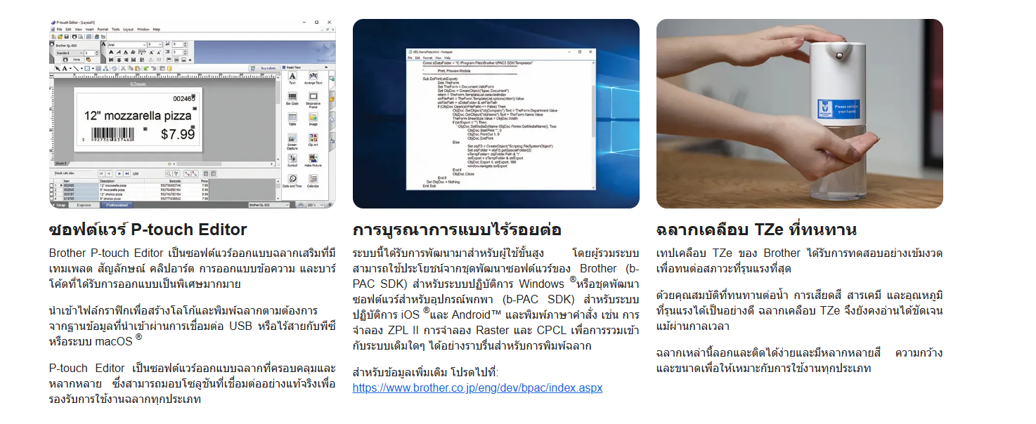 เครื่องพิมพ์ฉลากแบบต่อเชื่อมคอมพิวเตอร์ ความละเอียด 360 dpi, พิมพ์ได้เต็มฉลากยิ่งขึ้น 32mm (Print Height), รองรับการทำงานแบบเครือข่ายไร้สาย (wireless) วัสดุการพิมพ์ "TZE" และ "HGE" เทป ขนาด 3.5-36 mm